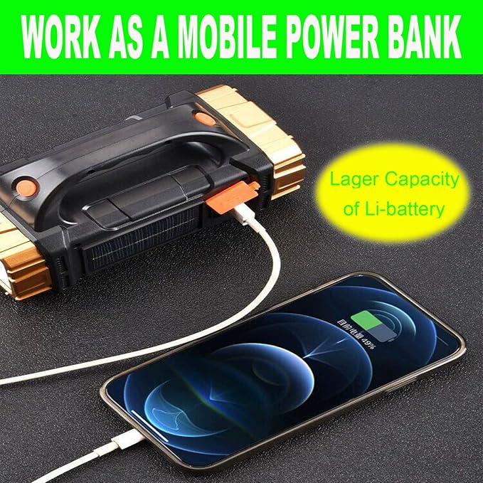 - USB CHARGING AND SOLAR POWERED, AS MOBILE POWER BANK: Solar powered or micro USB charging, 2 ways to makes full electricity, no need to worry about no power, especially in outdoor. The USB charging cable can charge by 5V USB ports. The USB output port at the bottom of the flashlight, it can serve as a power bank for your smartphone or mobile devices in emergency