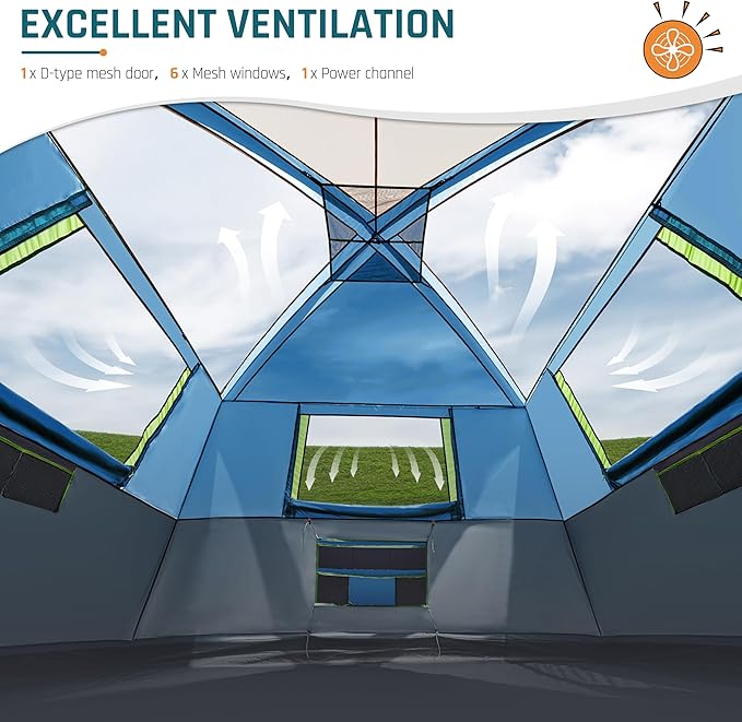- Water Resistance & E-Port: Our outdoor tent offers robust water resistance with a rainfly, taped seams, a tent skirt, and waterproof fabric. Plus, the rain-resistant E-Port makes it easy to access power inside the tent, keeping your devices charged and ready to use.