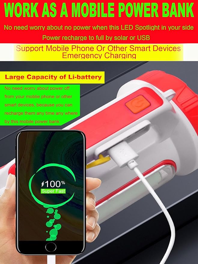 - SOLAR POWERED OR USB CHARGING, AS MOBILE POWER BANK: Solar powered or USB charging, 2 ways to makes full electricity, no need to worry about no power, especially in outdoor. The USB charging cable can charge by 5V USB ports. The USB output port at the bottom of the flashlight, it can serve as a power bank for your smartphone or mobile devices in emergency