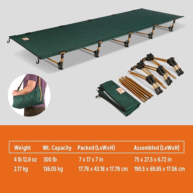 - CAMPSITE COMFORT: Easy to set up for a more comfortable sleeping surface above the elements. Cot accommodates large and small sleepers alike with a maximum capacity of 300 lbs., lightweight + sturdy aluminum frame