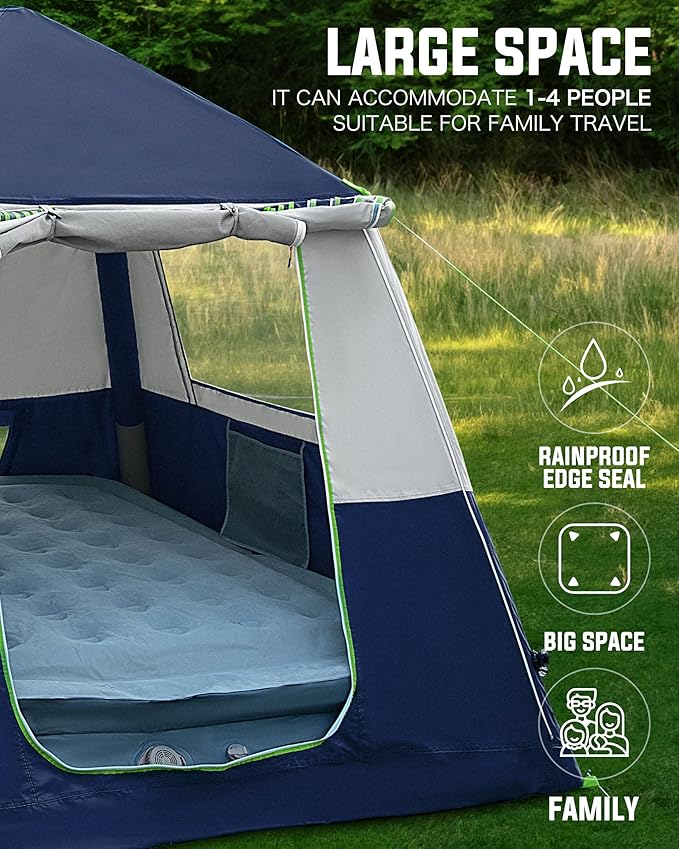 - 【SPACIOUS AND CONVENIENT】The 4-person instant cabin tent is 7.5ft x 7.5ft and fits one full-size mattresses easily with plenty of extra space, you can stand fully upright when changing clothes with a peak height of 5.8ft.