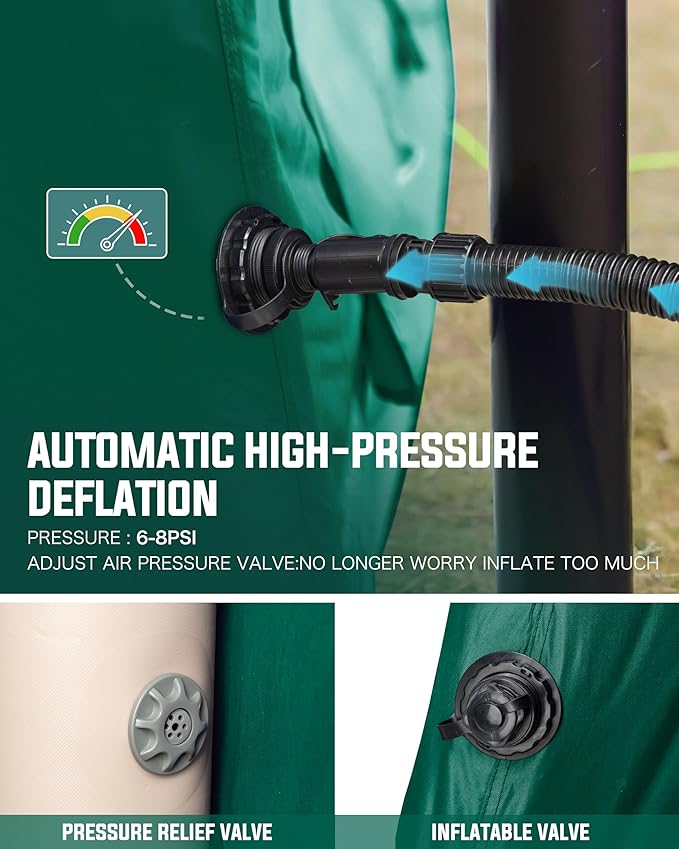 - 【EXCELLENT VENTILATION】The inflatable tent is equipped with 3 windows and 1 door, it provides ample airflow to keep the interior cool and comfortable. Enjoy natural light and fresh air, making your outdoor experience even more enjoyable. The windows and doors also offer easy access in and out, adding convenience to your camping. Choose now for a comfortable camping adventure!