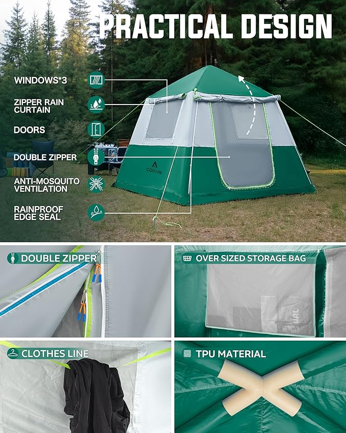- 【SPACIOUS AND CONVENIENT】The 4-person instant cabin tent is 7.5ft x 7.5ft and fits one full-size mattresses easily with plenty of extra space, you can stand fully upright when changing clothes with a peak height of 5.8ft.