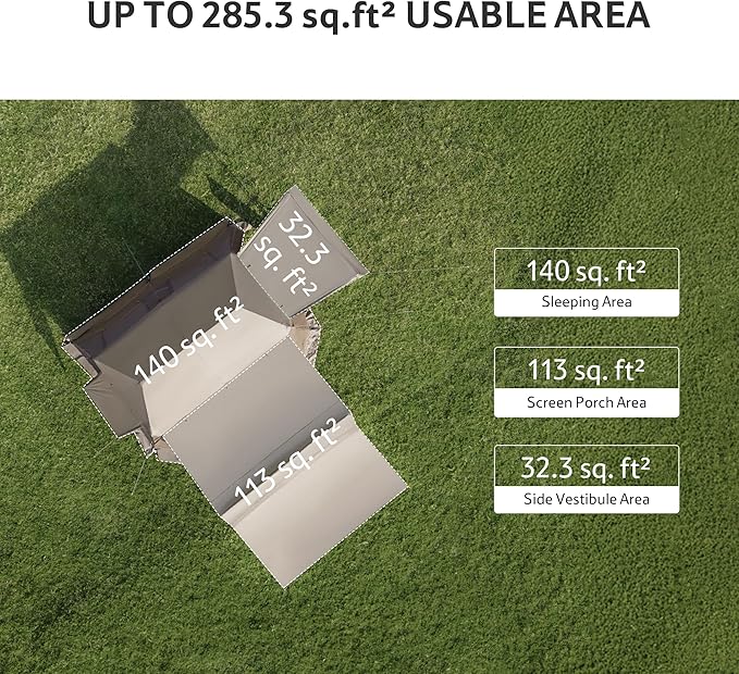 - 8 Person Tent with Screen Porch: 285.3 Sq.ft² total space (Sleeping Area: 140 Sq.ft² + Screen Porch: 113 Sq.ft²+ Side vestibule area:32.3 sq. ft²) fits 8 adults + camping gears. 72" ceiling height allows standing and walking around comfortably. Detachable screen porch expands usable space for gear storage or outdoor dining, the vestibule offer more shade area in warm seasons.