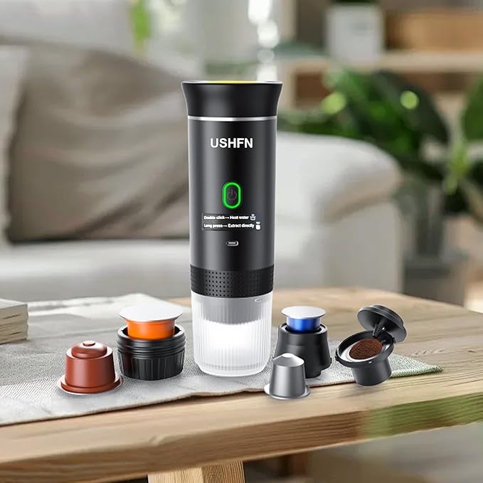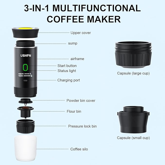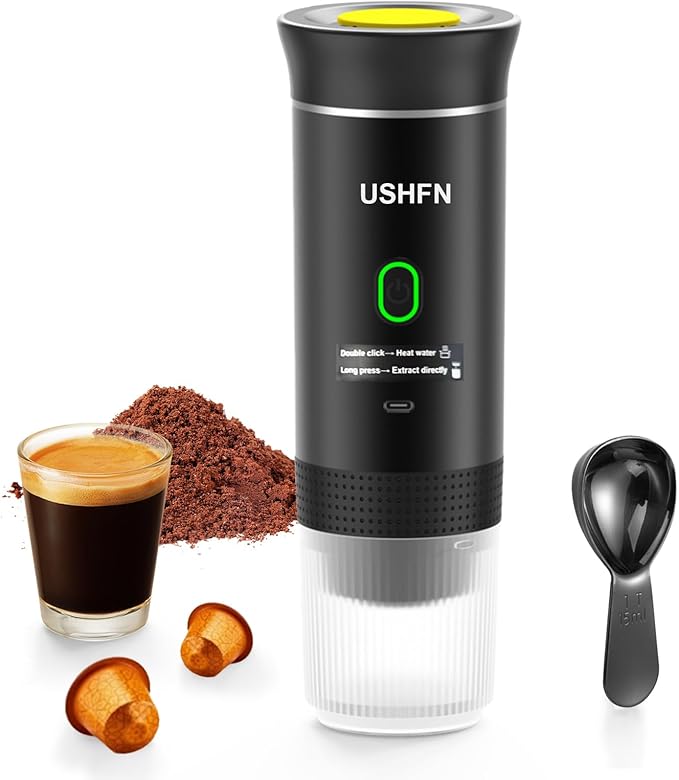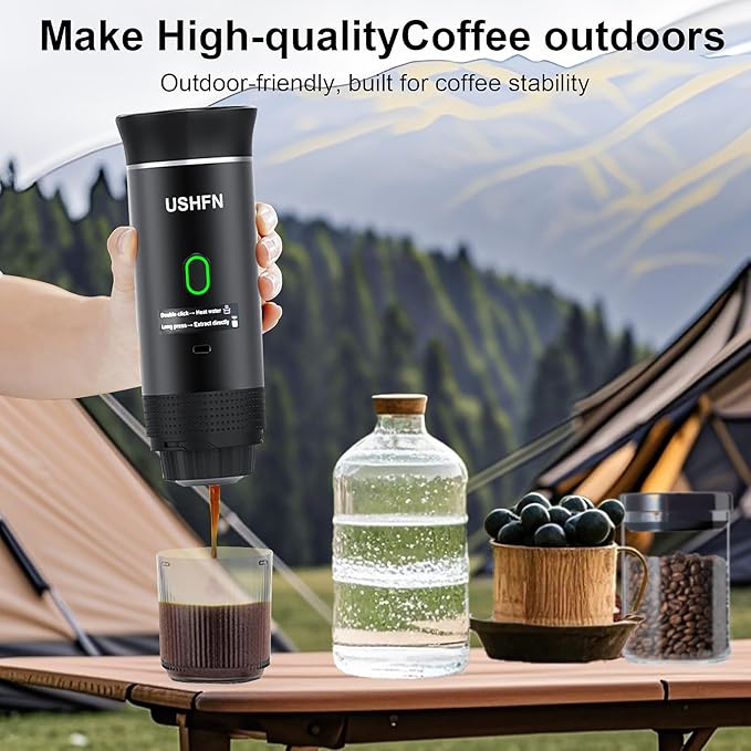 - 【3 in 1 Espresso Maker & Cordless Heating】USHFN Portable Espresso Coffee Maker Compatible with NS, DG Capsule & Ground Coffee, No need to connect the power supply.With just Double-BUTTON CLICK Self-Heating,You can enjoy espresso at RV, Hiking,Home