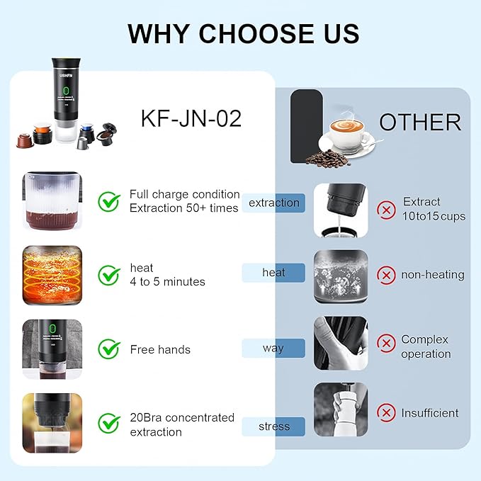 - 【USHFN SERVICE】USHFN Portable Electric Espresso Machine is equipped with a leak-proof and insulated design, providing a 12 month support period.Our Vision to provide perfect coffee maker portable,Let you enjoy fresh and delicious coffee
