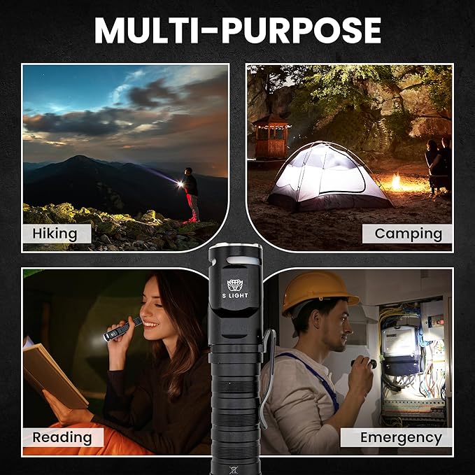 - Rechargeable & Energy-Efficient: Say goodbye to disposable batteries with this rechargeable flashlight. The USB charging capability ensures long-lasting performance, making it a reliable camping light, strobe light, or everyday companion.