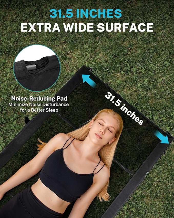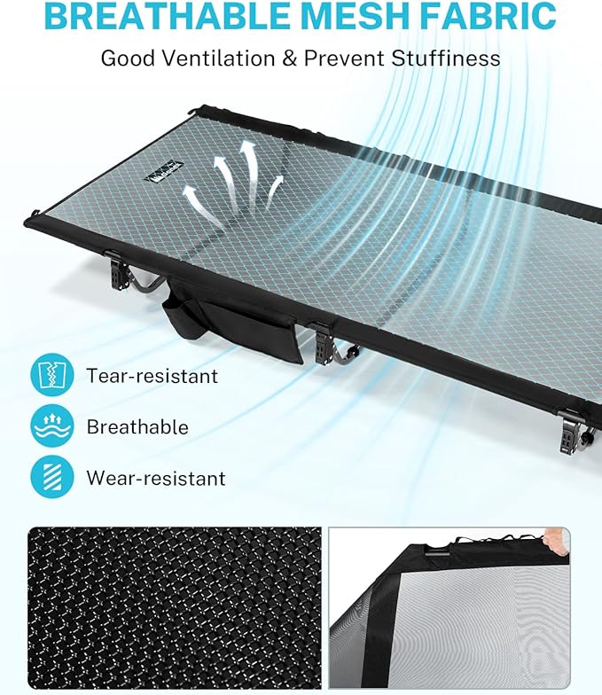 - 【Breathable Mesh Fabric】 The camping bed is made of a new-technology 31.5-inch extra-wide nylon mesh surface, which has excellent ventilation, high elasticity and prevents stuffiness, allowing you to always maintain a refreshing and comfortable sleeping experience