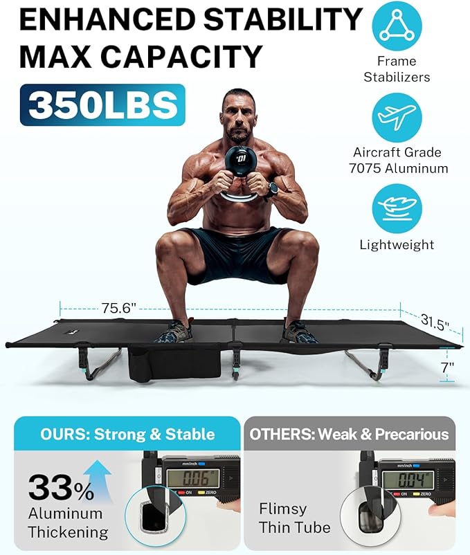 - 【Sturdy & Stable】 The camping cot uses aerospace-grade 7075 aluminum for bars and legs, featuring a groundbreaking dual-tube design and an arched square tube bottom bracket, makes sturdy and stable enough to support up to capacity of 350 lbs