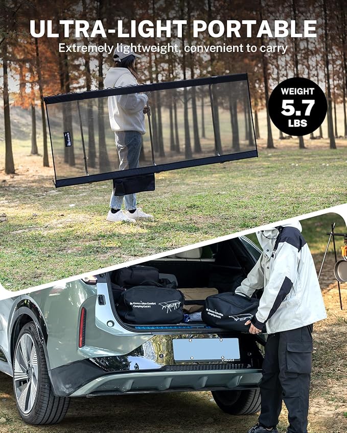 - 【Ultralight & Portable】 The camping cot weighs only 5.7 pounds. The portable camping bed comes with a carrying bag and can be widely used for camping, hiking, backpacking, fishing, beach, tents, pets,etc. Folds to fit in most cars & trunks