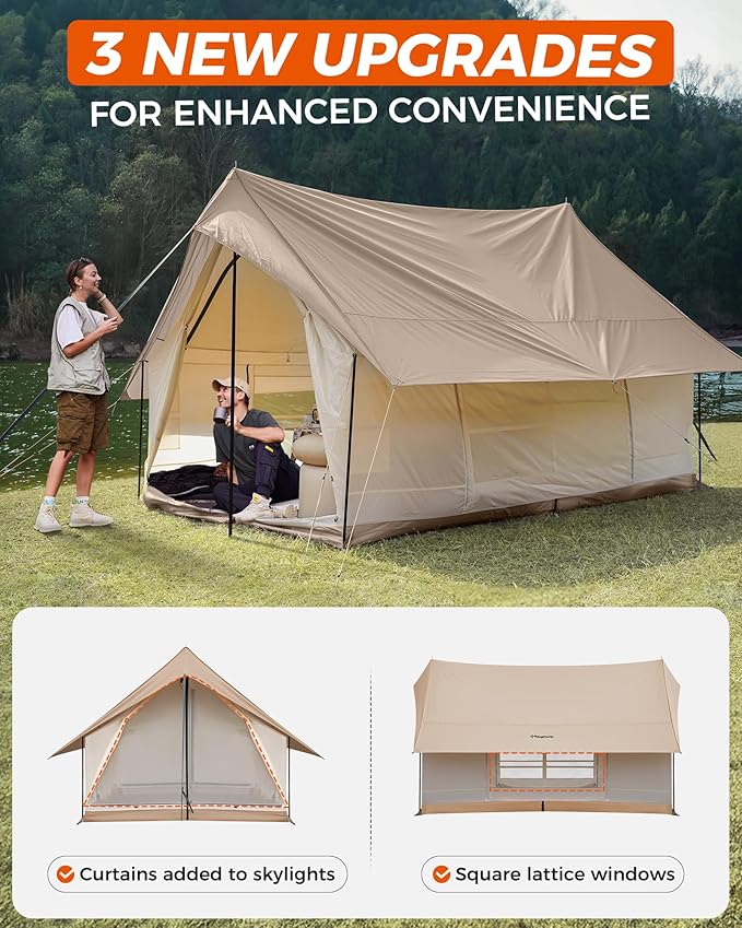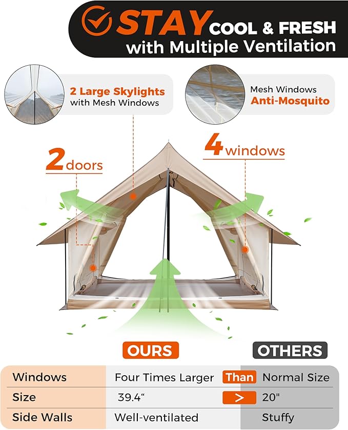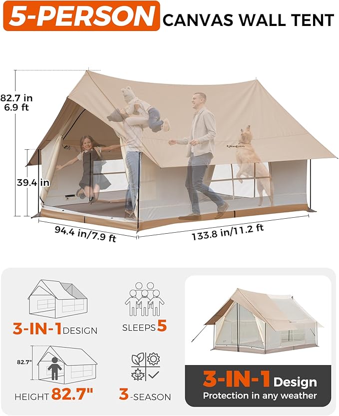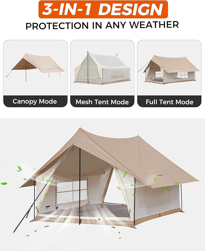 - ALL-WEATHER PROTECTION: Built for year-round adventure, this double-layer cabin tent features a rugged outer canvas that shields against sun and rain, and a breathable mesh inner tent for optimal airflow. Both layers can be used independently, making it ideal for a variety of outdoor conditions.