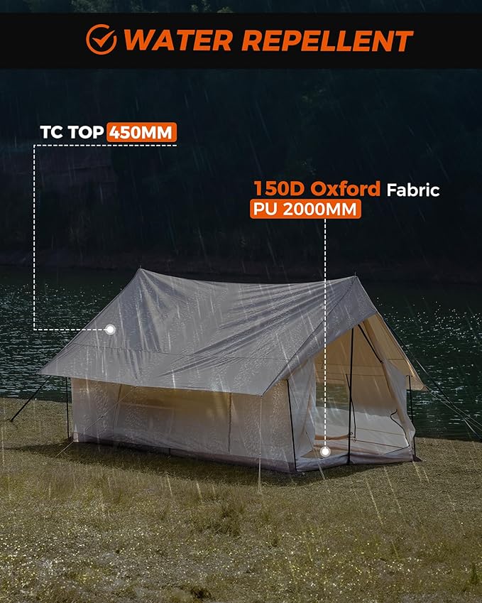- RELIABLE RAIN PROTECTION: Stay dry in unpredictable weather. The outer tent is crafted from a 210g polycotton blend (450mm waterproof rating), while the base and rainfly use 150D Oxford fabric with a 3000mm PU coating—offering solid protection in moderate to heavy rain.