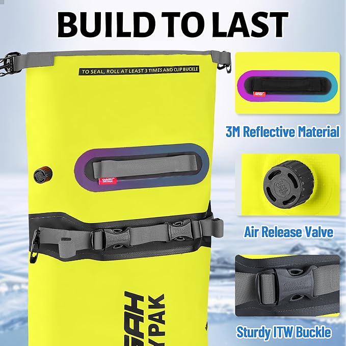- SECURE ROLL-TOP CLOSURE - Our waterproof backpack is equipped with a roll-top closure system that ensures a tight, watertight seal, effectively keeping water out. This design keeps your belongings dry, even in the wettest conditions. The roll-top mechanism also provides easy access to your items and allows you to adjust the bag's size based on your load, offering both convenience and versatility on your adventures.