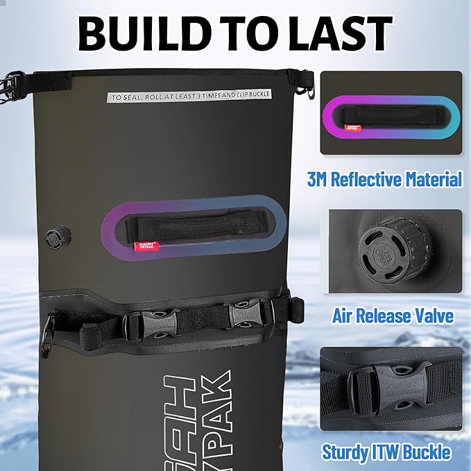 - SECURE ROLL-TOP CLOSURE - Our waterproof backpack is equipped with a roll-top closure system that ensures a tight, watertight seal, effectively keeping water out. This design keeps your belongings dry, even in the wettest conditions. The roll-top mechanism also provides easy access to your items and allows you to adjust the bag's size based on your load, offering both convenience and versatility on your adventures.