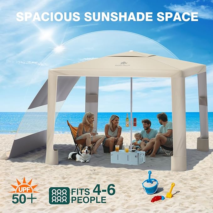 Rhino Valley Beach Cabana, 8 × 8FT Foldable Beach Tent with Cup Holder, Beach Canopy Easy Setup with UPF50+ Protection, Windproof Stable Beach Tent, Portable Beach Cabana Tent for Beach Camping