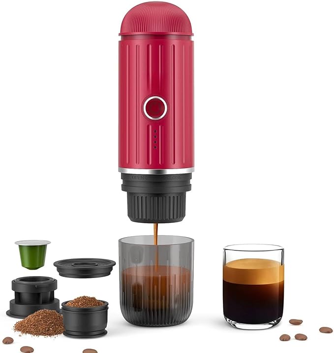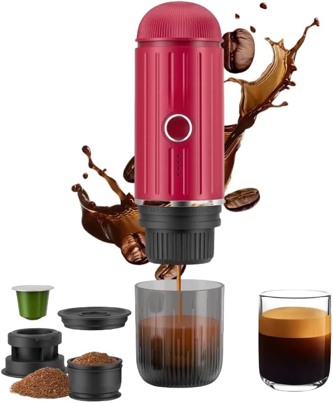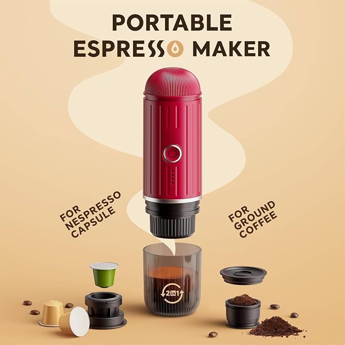Portable Espresso Machine with 3-4 Min Self-heating, 12V Rechargeable Electric Coffee Machine 19 Bar Compatible with NS Capsules and Ground Coffee (Red)