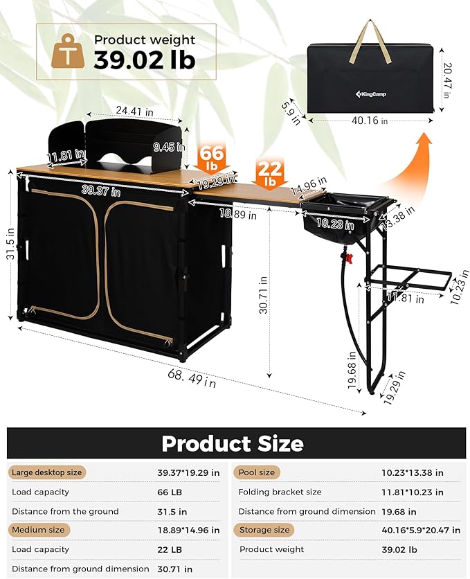 KingCamp Bamboo Camp Kitchen Station, Folding Overland Camping Kitchen Table Hooks Portable Outdoor Cooking with Adjustable Lantern Pole & Windshield Storage Organizer for Tailgating BBQ Picnic RV