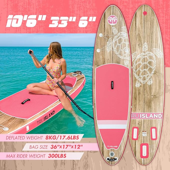 • Stand Up Paddle Board Size: The Board model is 10.6 ft x 33 inches wide x 6 inches thick. It weighs only 19lbs and it provides a large, wide platform for stability on the water along with the ability to support riders up to 300 lbs.Inflatable paddleboards are great fun and a beach essentials when touring with pets and kids. We recommend inflating the board to a pressure of 13 psi up to a maximum of 15 psi for use in different environments such as ocean, lake, ponds, rivers and pool.