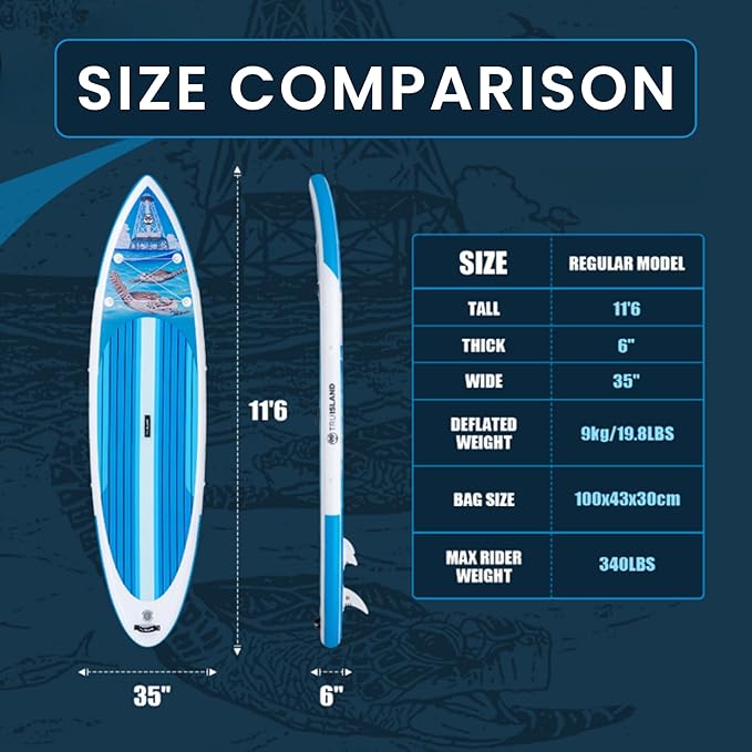 - Paddle Board Size: TRU Island Inflatable Stand Up Paddle Board is made with the perfect size for stability , 11"6 x 35" x 6". With a wider deck and wider nose, it can carry up to 450 lbs‼ An extra 3’ of width (compared to a 32’ board) is designed to provide better stability and striking balance, the paddle board can accommodate 2 adult, and families with children or pets, big people, large size people, and is ideal for yoga, fishing, surfing, snorkeling with plenty of room for gear.