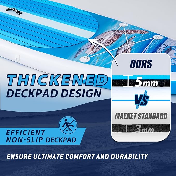 - Thickened deckpad:We used premium 5mm deckpad foam to ensure ultimate comfort and durability for our boards.Relax the feet to make body more comfortable and not too painful to fall on the board. Most company’s use much thinner deckpad but this is a testament to our quality and not cutting corners in every step of our board design