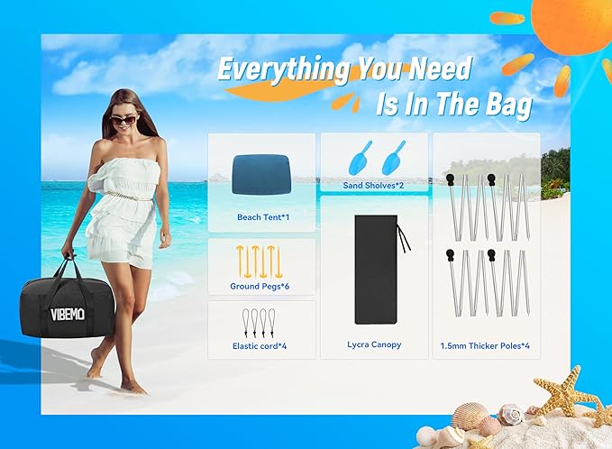 Beach Tent, Camping Sun Shelter UPF50+ with 6 Sandbags, 2 Sand Shovel, 4 Stability Poles, Outdoor Pop UP Beach Canopy for Camping Trips, Fishing, Backyard Fun, Picnics-Navy Blue
