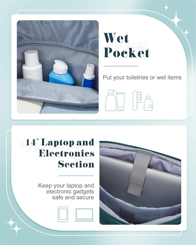 • Effortless Organization: Overnight bag keeps you organized on the go. The interior of the Weekend Bag is very spacious, it has multiple compartments and pockets including a 14” laptop compartment for clothes, cell phone, keys, glasses, toiletries, and other travel accessories, allowing you to make the most of your luggage space.This multi-functional carry-on bag will help you organize and store your items with ease, making them easily accessible when you need them.