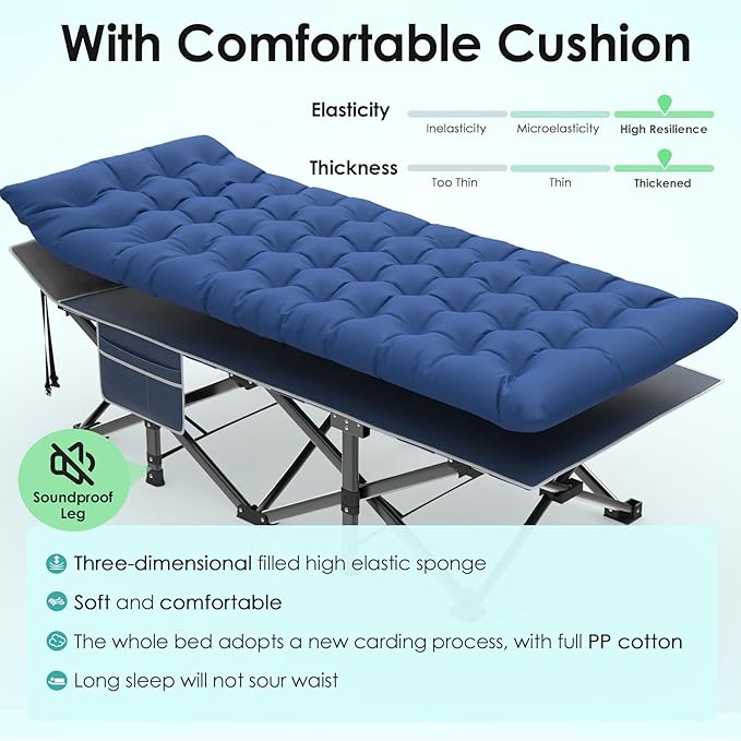 - 【Removable Skin-Friendly Mat】Our camping bed cot for adults has a soft and removable Mat, the 4" thicken cushion makes you more comfortable and warm when resting or sleeping. The cushion is made of skin-friendly and comfortable fabric, which is very suitable for people with sensitive skin or kids. You can also remove the mat when the weather is hot,and tie it up with the delivered zinc alloy buckle strap