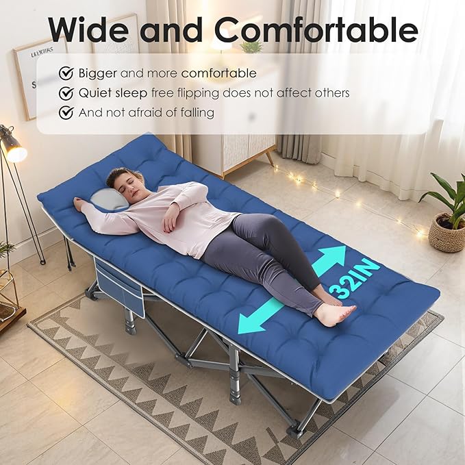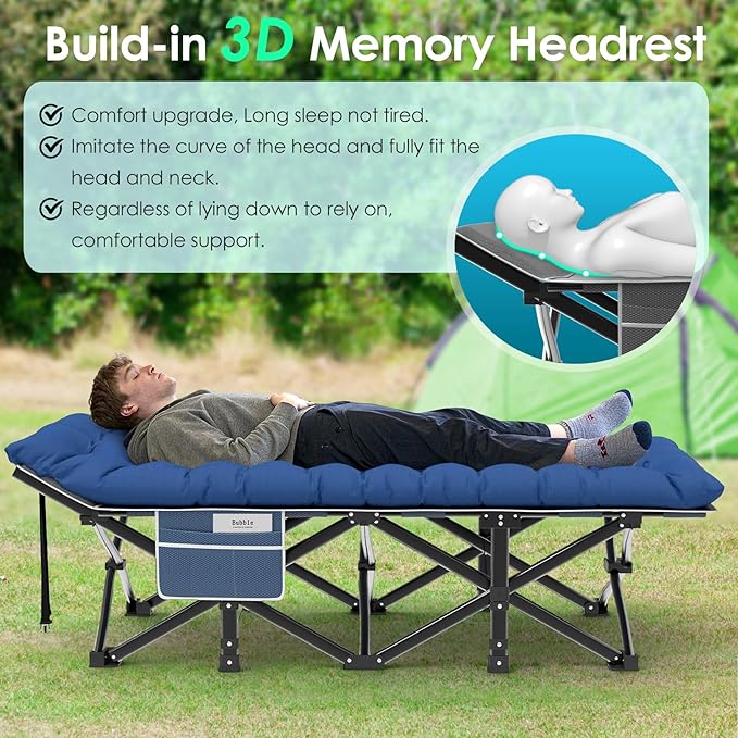 - 【Built-in Pillow Design】The headboard of our cot is a slanted design with built-in pillows, no need for extra pillows. The slight incline is ergonomically designed to ensure no more back, neck or shoulder pain in sleep! The mattress is also soft and thicker, so this is a very comfortable folding camping cot