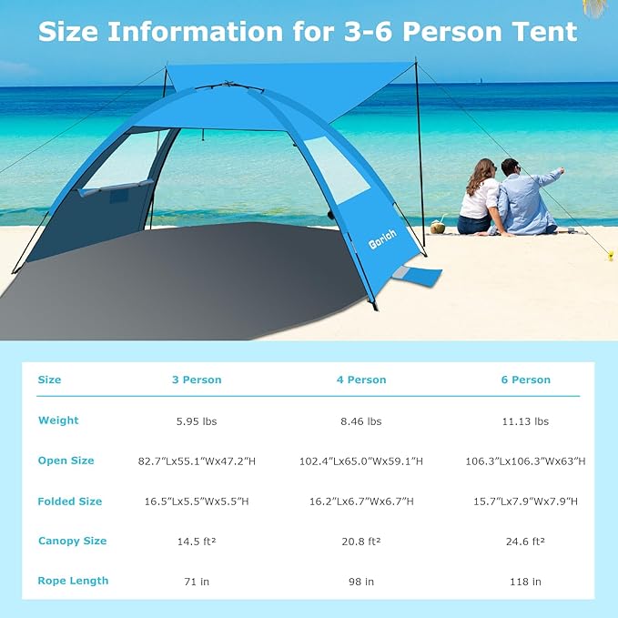 Gorich Beach Tent with Canopy - Easy Setup 3-6 Person Portable Sun Shelter, UPF 50+ UV Protection Sun Shade, Lightweight & Compact Beach Cabana for Family Travel