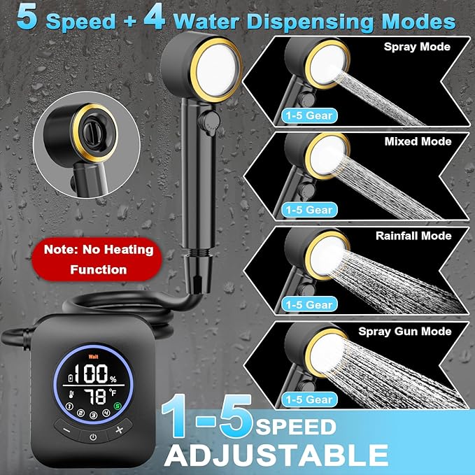- 【5-Gear Water Pressure and 4 Spray Modes】The camping shower head has 5 adjustable speeds of high water pressure and four practical water dispensing settings (3 speed modes + spray gun mode), allowing you to customize the water flow intensity according to different needs, whether it is cleaning, showering or other activities. The maximum water flow rate provided by our outdoor shower is 6L/min, providing a more pleasant shower experience.
