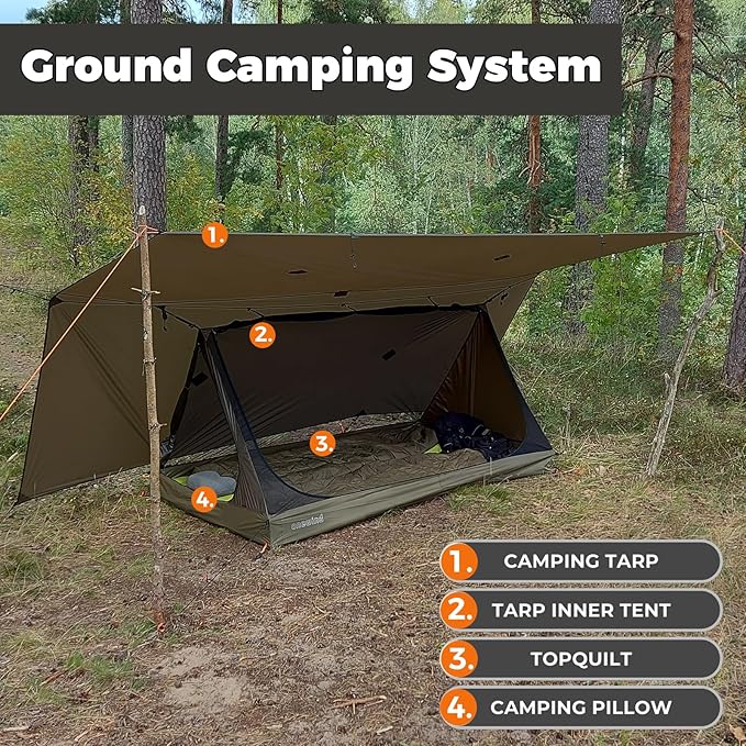 - Complete Shelter Solution: Get ultimate protection and comfort with our tarp and inner tent combo. The weatherproof tarp shields you from rain and sun, while the breathable inner tent keeps bugs out and ensures a restful sleep. Lightweight and versatile—ideal for any outdoor adventure!