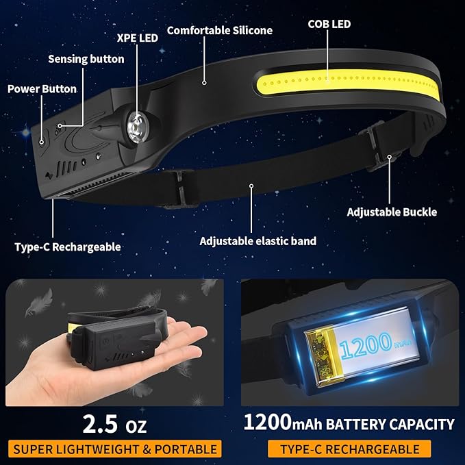 - 【Motion Sensing & 5 Light Modes】Head lamps have 6 working modes, including COB high mode, COB low mode, LED high mode, LED low mode, and strobe mode to meet all scenarios. The head lamp has sensitive intelligent sensor, so that you can press the sensor mode button and turn the head flashlight on or off with a wave of your hand.