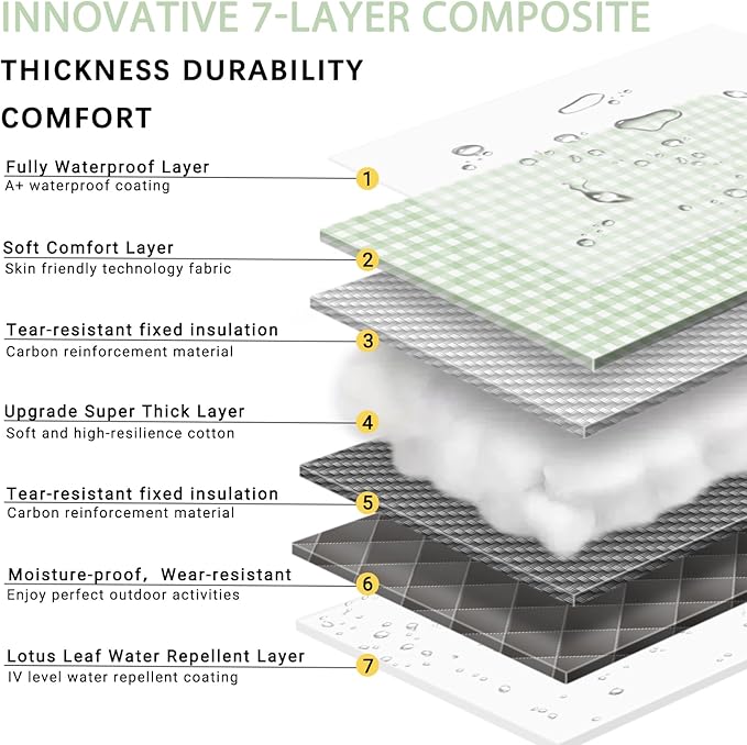 - [7-Layer Structure]This picnic mat features an advanced 7-layer structure design, with a soft cotton layer in the middle that provides excellent cushioning. This ensures a comfortable sitting and lying experience during outdoor activities. Whether you're on grass, sand, or using it indoors, it offers ample support.