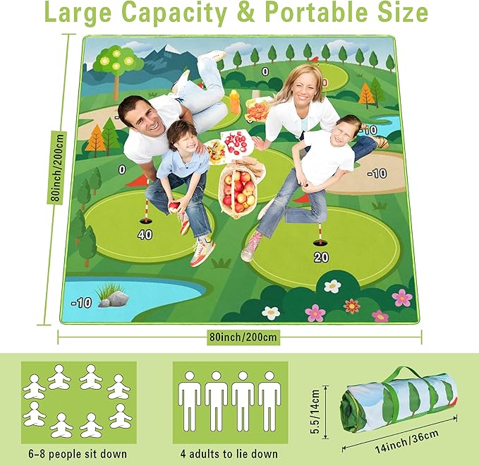 • This picnic blankets measures 80”L x 80”W,is large enough for 6-8 adults to sit, accommodating up to 4 adults lying and provides enough space for food and drinks. Our large picnic blanket is the best choice for a family outing or friend gatherings.