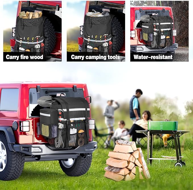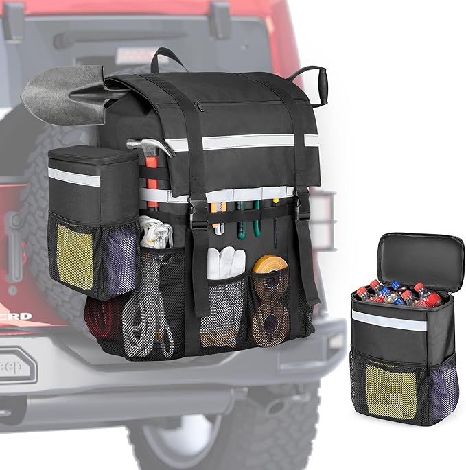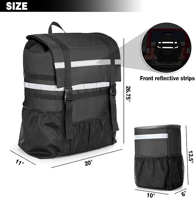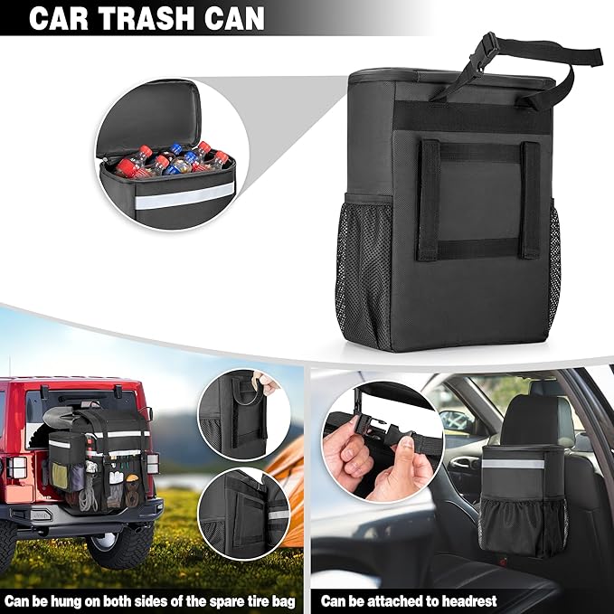 - CAR TRASH CAN: Comes with a detachable car trash can which can be hung on both sides of the spare tire bag. The outside pockets are handy for holding small items. The top adjustable strap can be attached to headrest easily with a clip.