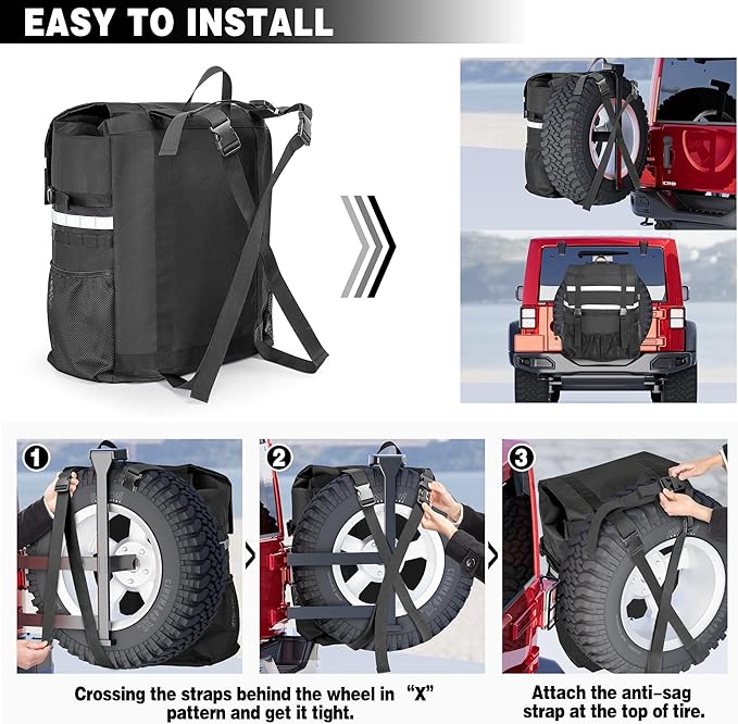 - HOW TO INSTALL: Crossing the straps behind the wheel in “X” pattern and get it tight. Then, attach the anti-sag strap at the top of tire. There is plenty of strap length which fits spare tire up to 40".