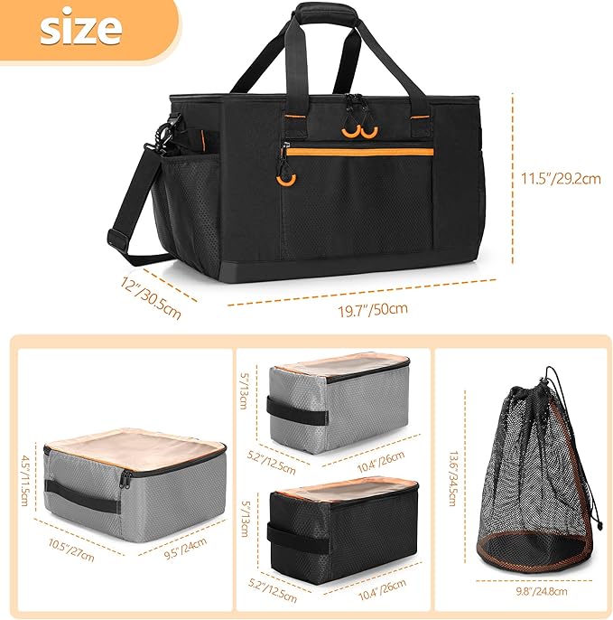- Practical: Dimension: Small: 5.2”*5”*10.4”, Large: 10.5”*4.5”*9.5”, Mesh Pocket: Diameter: 9.8”, H:13.6”, Storage bag: 19.7"*12"*11.5"; The front and side pockets of the camping storage box bag have extra storage space, with large capacity to hold all gear, making it an ideal organizer bag for home, picnics, outdoor and travel