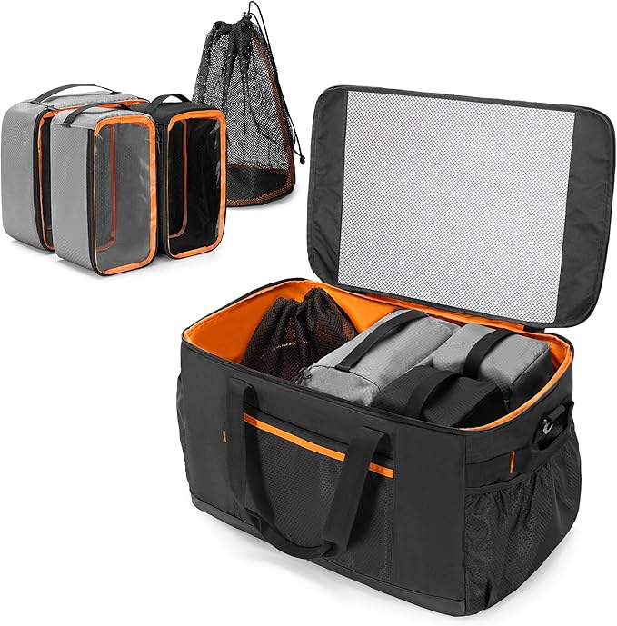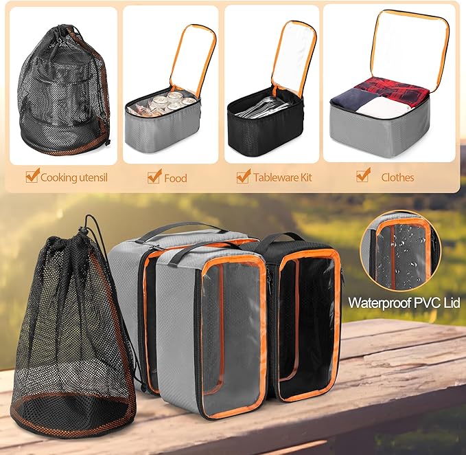 - Camping Organizer Box Kit: 2 color packing cubes in total 3 pcs + 1 mesh pocket, which can be placed in the attached extra large storage bag, and hold all your camping equipment or kitchen necessities