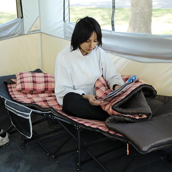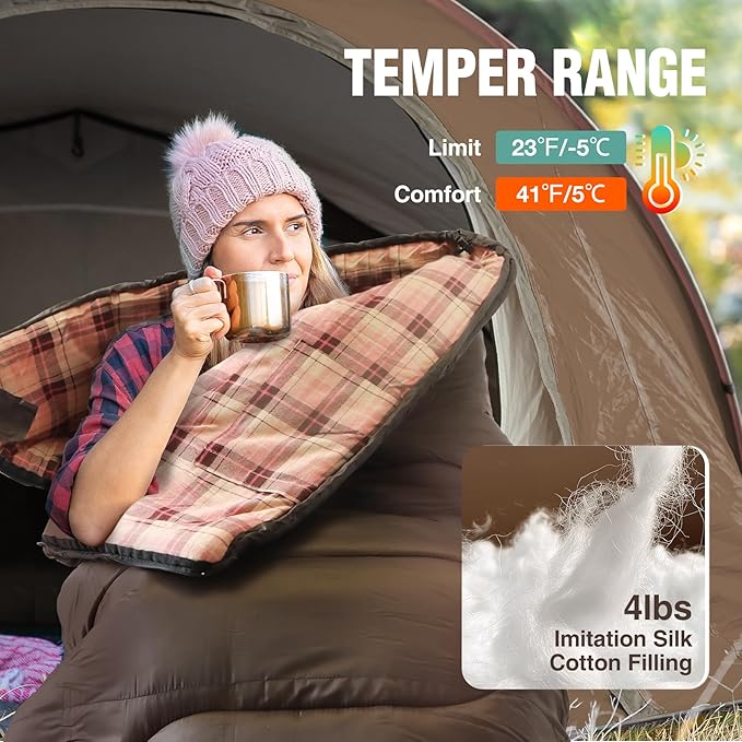 - Exceptional Comfort and Warmth: The lining of this camping sleeping bag is crafted from 100% pure cotton flannel, ensuring outstanding breathability and a skin-friendly touch. With 4 lbs imitation silk cotton filling, it provides reliable warmth, keeping you cozy in temperatures ranging from 23°F /-5°C to 41°F / 5°C.