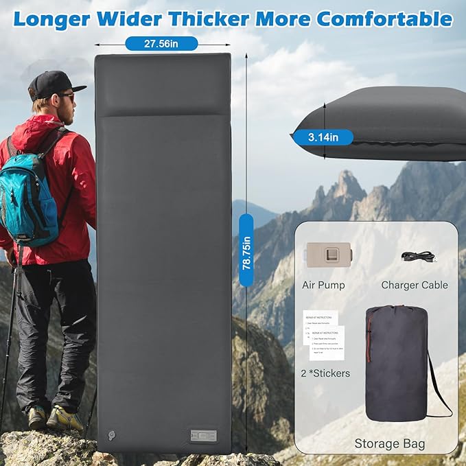 - Expanded Size: inflatable sleeping pad for the comfort of outdoor camping sleep, we have upgraded the size of the foam camping pad, which is wider and longer compared to other single person sleeping mats. The inflatable mattress camping measures 27.56 inches x 78.74 inches x 3.14 inches and can be folded up to 26.37 inches x 9 inches, weighing 7.27 pounds. This camping mattress also comes with strong stickers to deal with sudden situations where sharp stones cut the mat during camping