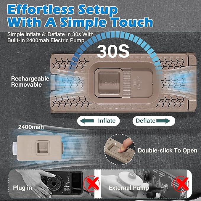 - Easy To Store&Carry: After deflation, the thickness of foam sleeping mats for camping is compressed by more than 50%, making it easier to store and save space compared to ordinary sponge sleeping pads. Camping mattress pad suitable for tent camping, SUV camping travel, and car travel. The camping sleeping mat contains a 2400Ah large capacity battery, which has enough power to fill the inflatable camping mat about 7 times. Making USB-C charging more convenient. The full charging time is 2-3 hours