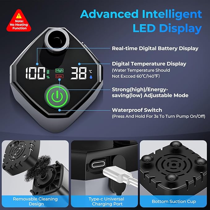 - 【Real Time Smart LED Display】 Our outdoor shower features an advanced LED display that provides a clearer indication of power status, water temperature and running devices. This portable shower can be switched between two modes: high power mode / low energy saving mode. The “high” mode lights up green and the “low” mode lights up red. The water temperature ranges from 32-140°F (0-60°C) Enjoy your outdoor adventures without worrying about the outdoor shower. Note: No Heating Function