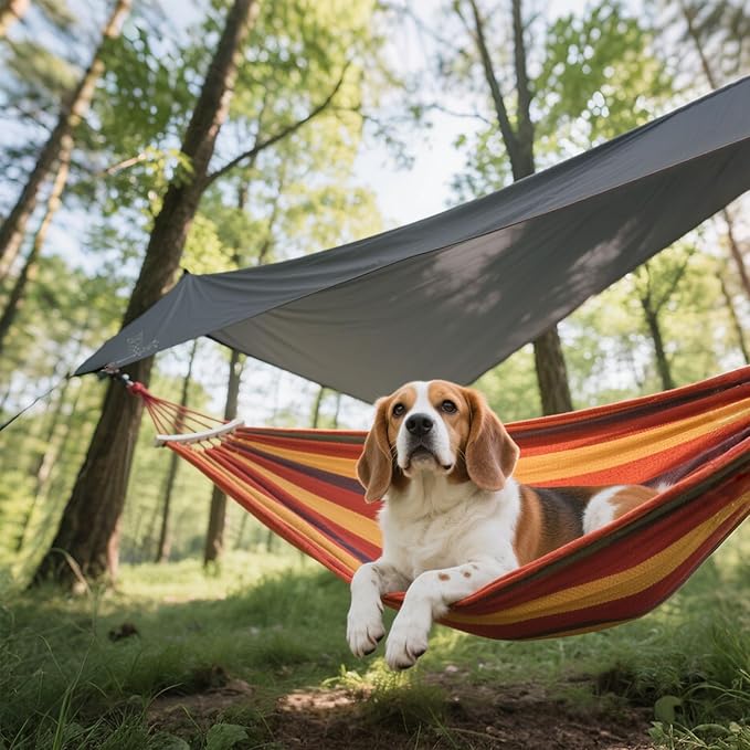 - Easy Setup: Equipped with aluminum tent stakes and six 10" guy line cords that tighten at every corner, our hammock tarp makes setting up a breeze
