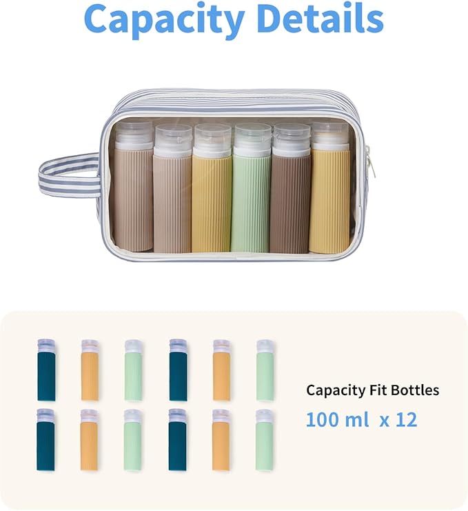 Narwey Striped Clear Makeup Bag Cosmetic Bag with Zipper for Travel, Clear Toiletry Bags for Traveling Toiletries Women Men, Make Up Pouch with Handle, Skincare Bag (Greyish Blue Stripe)