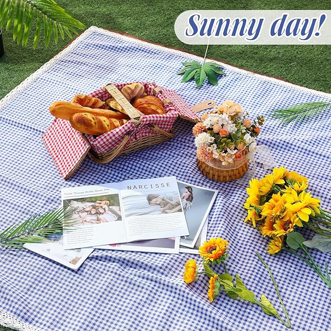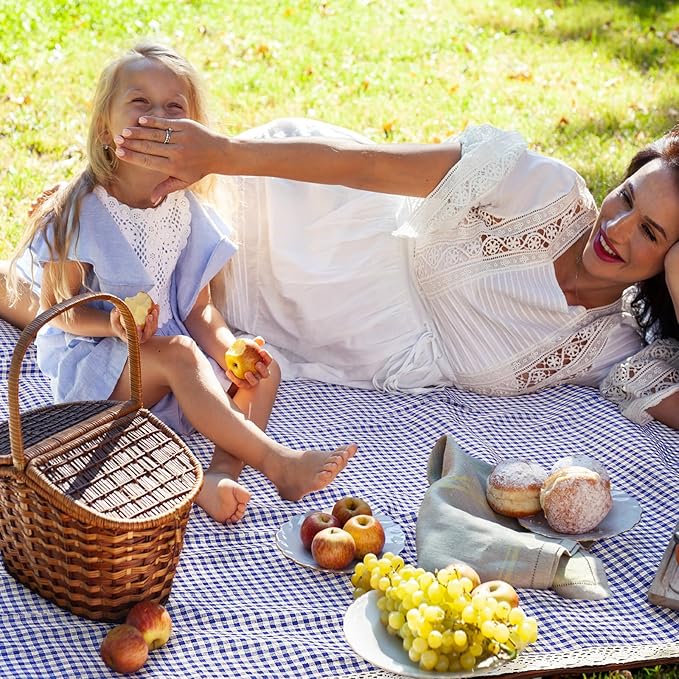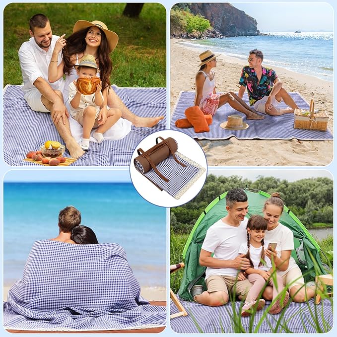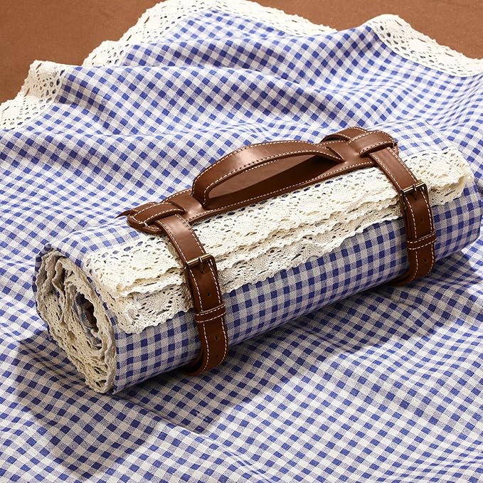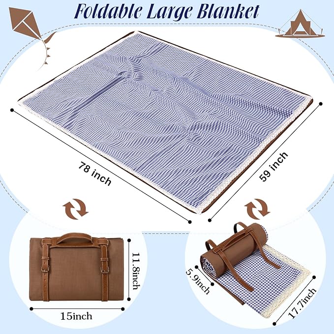 - Practical 2 in 1 Design: the 2 in 1 design enables our blue and white plaid camping blanket to cater to multiple uses; The top layer with a boho lace style, serves as a cozy blanket; Simultaneously, the brown bottom layer serves as a waterproof mat that is resistant to moisture and dirt, providing you with a comfortable outdoor experience; Besides, it is a nice photo background; Note: the upper fringe blanket need to be washed to get better using experience, both machine wash and hand wash