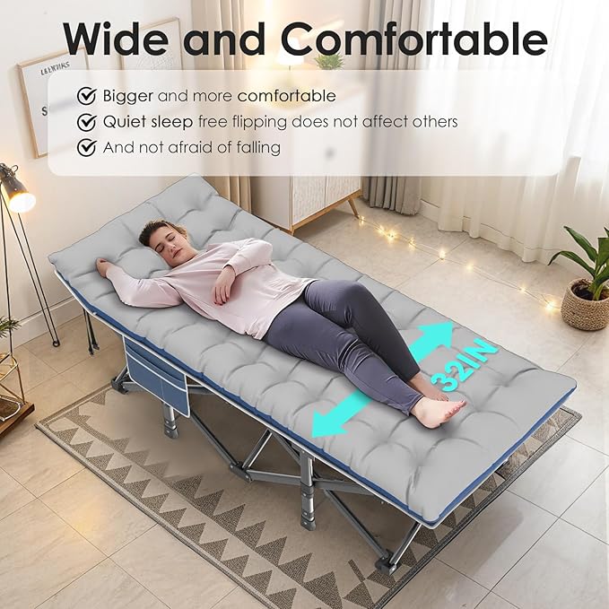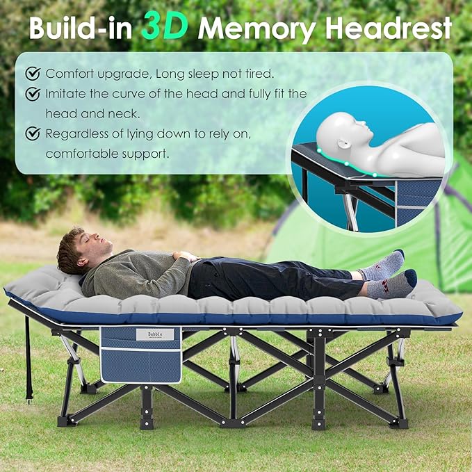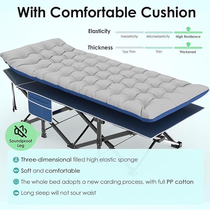 - 【Built-in Pillow Design】The headboard of our cot is a slanted design with built-in pillows, no need for extra pillows. The slight incline is ergonomically designed to ensure no more back, neck or shoulder pain in sleep! The mattress is also soft and thicker, so this is a very comfortable folding camping cot