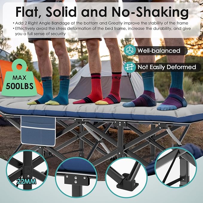 - 【Removable Skin-Friendly Mat】Our camping bed cot for adults has a soft and removable Mat, the 4" thicken cushion makes you more comfortable and warm when resting or sleeping. The cushion is made of skin-friendly and comfortable fabric, which is very suitable for people with sensitive skin or kids. You can also remove the mat when the weather is hot,and tie it up with the strap in it
