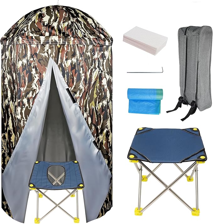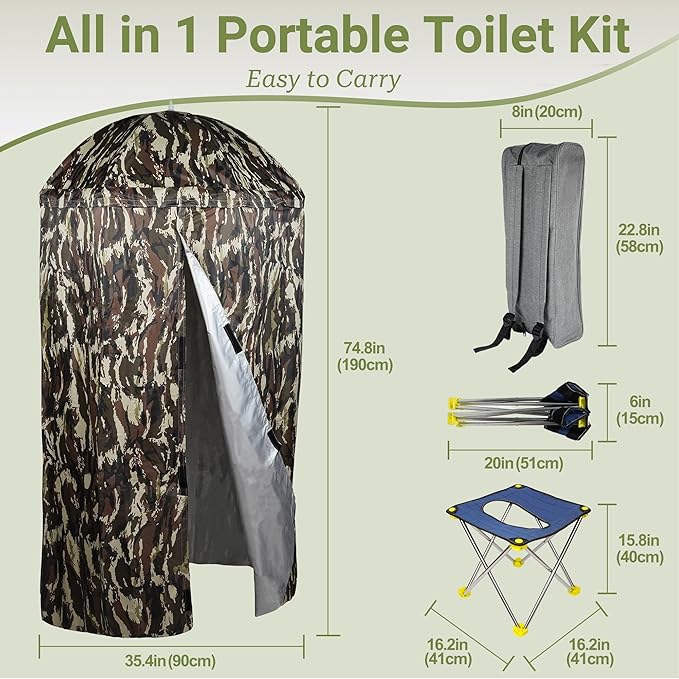 - All in 1 Portable Toilet Kit: Our unique portable toilet paired with a privacy tent, offer a comfortable outdoor solution for the entire family. Whether you're on a camping trips, hiking, long road trips, boating, fishing, beach trips, even attending a music festival, you have no worry about finding a restroom anymore or a changing room.