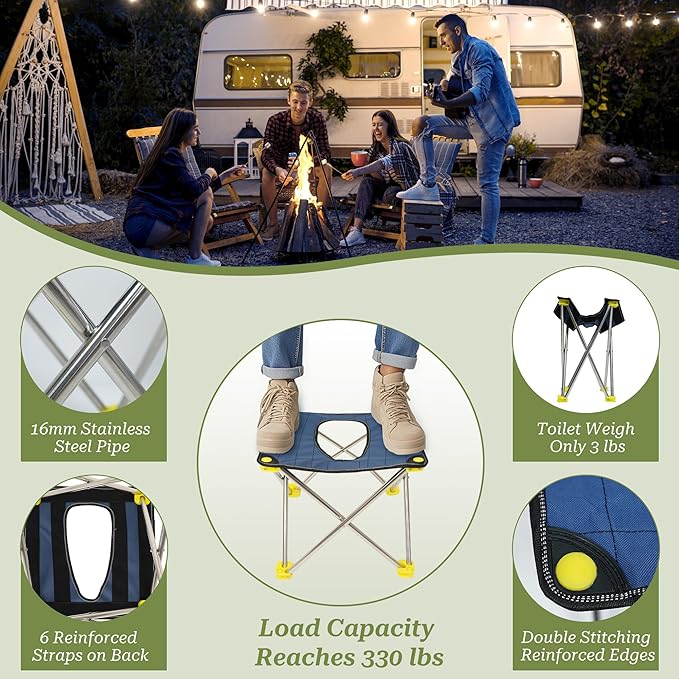 - Strong Durable and Reliable: This portable camping toilet frame is made from 16mm stainless steel pipe. Soft seat made from 600D Oxford fabric, on the back of the toilet seat, there are 6 reinforced straps with double stitching to ensure safety and stability. Load capacity reaches 330 lbs. The privacy tent is made from firm and tear-resistant 190T polyester fabric to ensure complete privacy.