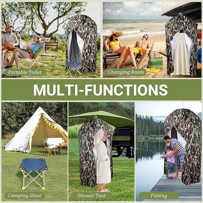 - Multi-Functional: This is more than just a portable potty and changing room, it transforms into a trash can, collapsible stool, camping chair and a good camping stool. The privacy tent provides a private space for outdoor showers, quick outfit swaps at the beach, outdoor photo shoots, or dance competitions.